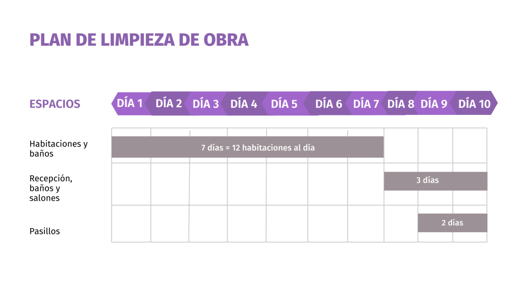 Realizar la limpieza de obra del hotel y entregar las habitaciones montadas, en 15 días, con un equipo de 10 personas en jornadas de 8 horas: